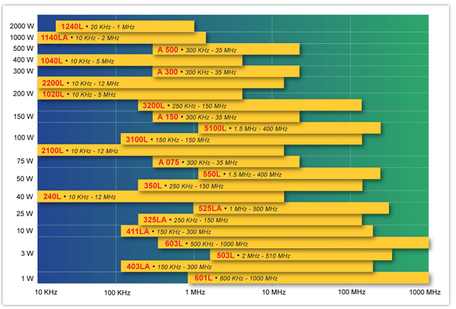 | 3100L | 250KHz ~ 150MHz | A | 100W | 250KHz ~ 150MHz >125W 1MHz ~ 100MHz >150W |